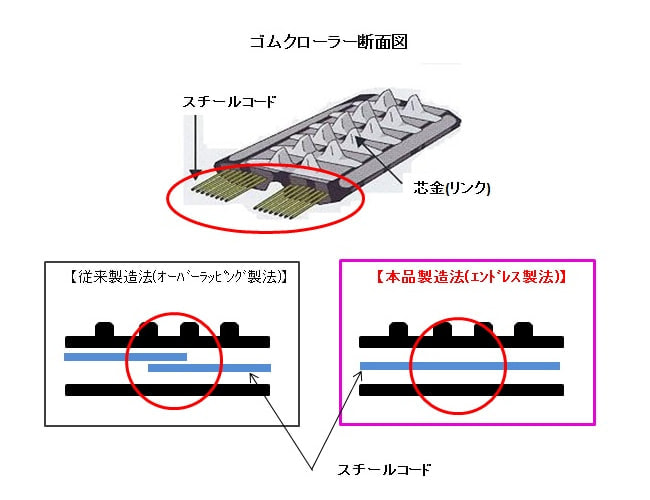 従来製造法のオーバーラッピング製法によりゴムクローラーの破断の原因の多くが